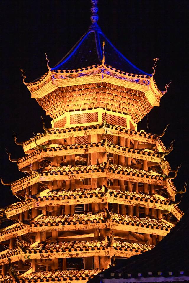 信团鼓楼:十一重檐八角攒尖顶,高25.9米,占地面积78.3平方米。该鼓楼有一副楹联:鼓乐声声京城震动雄证当今盛世;楼阁巍巍侗寨欢呼讴歌天下太平。