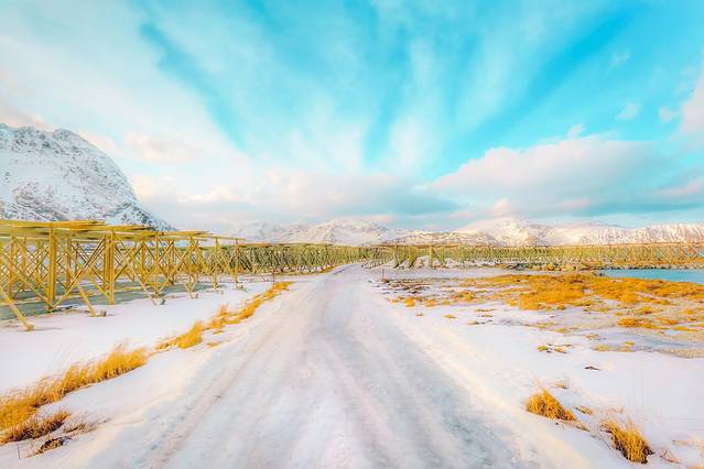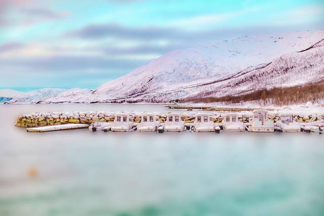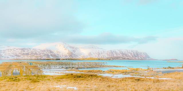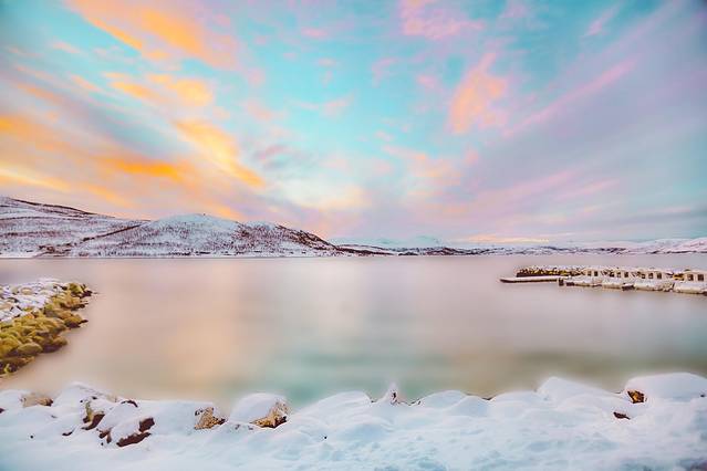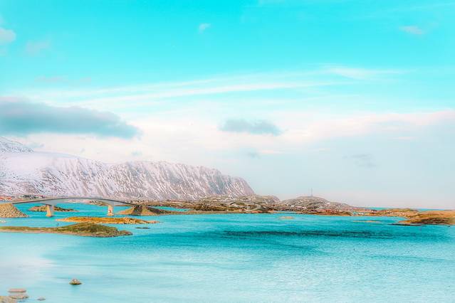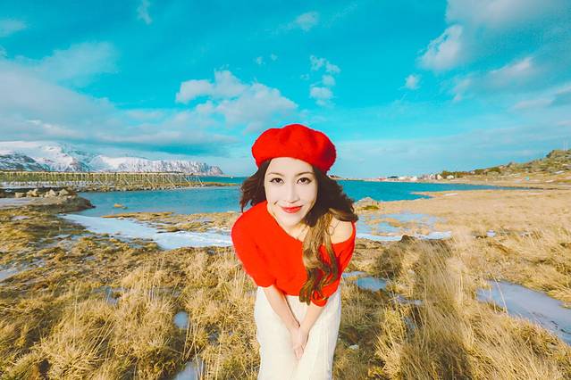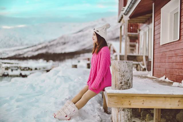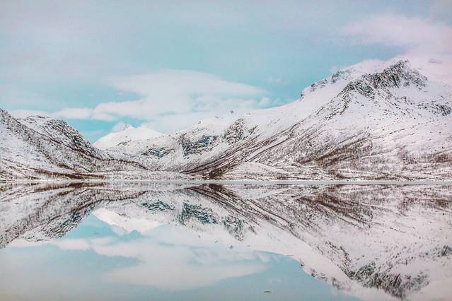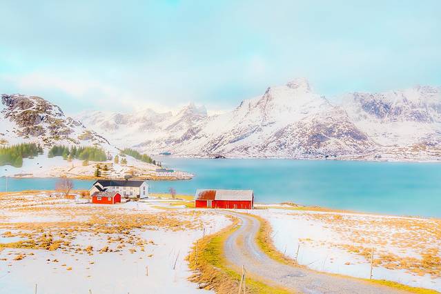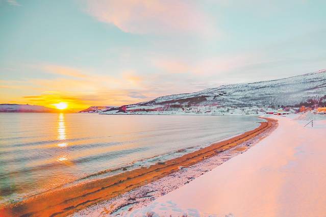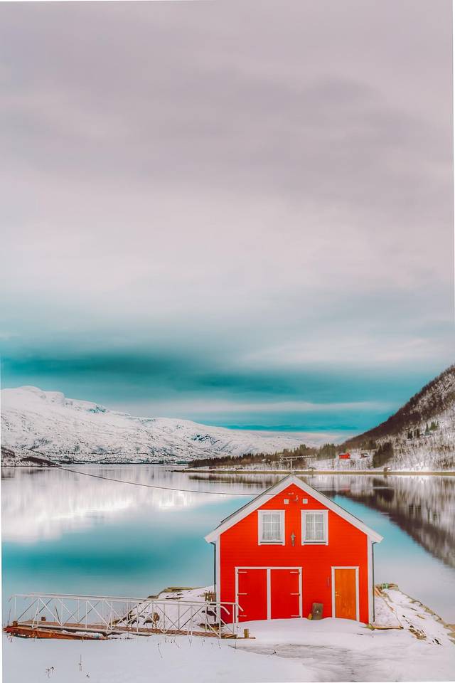 傍着峡湾,靠着雪山,垫着白色的大地,我沐浴在天堂一般的美景之中,看着隔着 挪威 海的白雪皑皑的山慵懒地被飞鸟掠过,看着稀疏的 云和 太阳的光线在峡湾里相互追逐。山上稀疏的植被在厚重的雪堆里显得格外坚强,而不多的几棵松树则显得十分悠闲,倚靠着小木屋烟囱冒出的青烟,