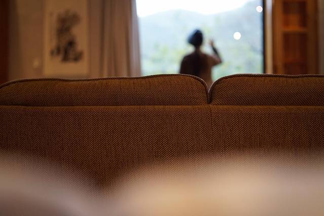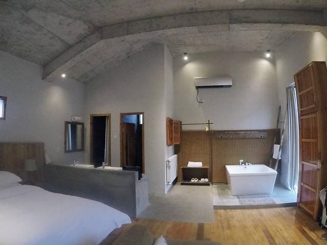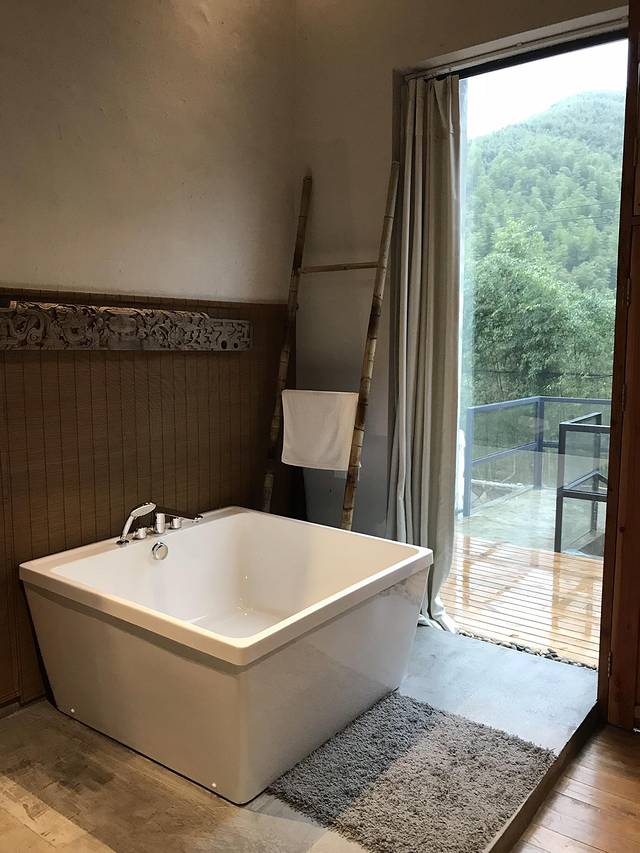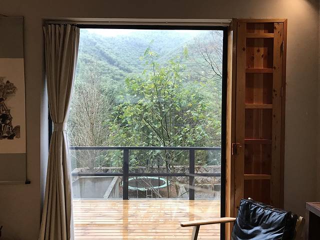 拉开窗帘,躺在床上、泡着澡,就能看见远方的山,绿色的树;