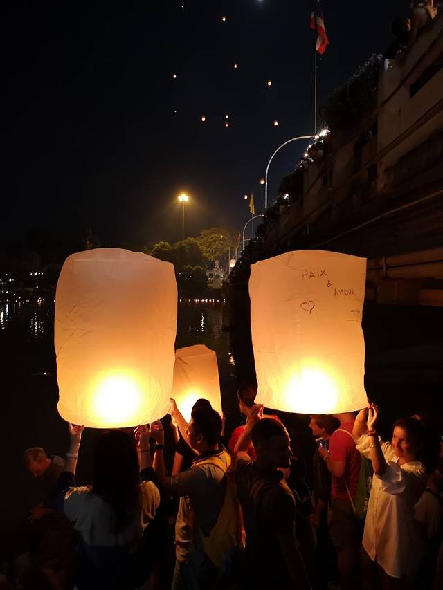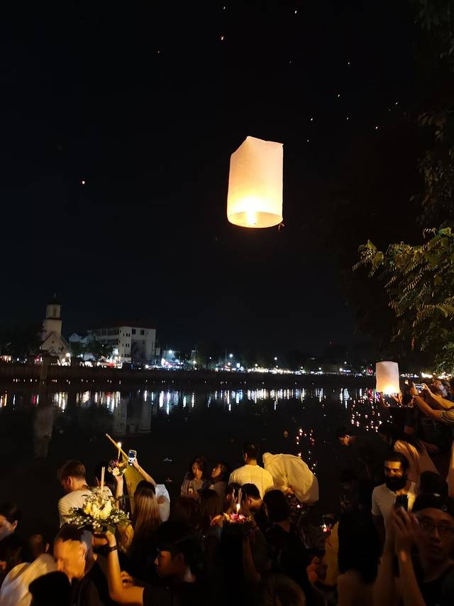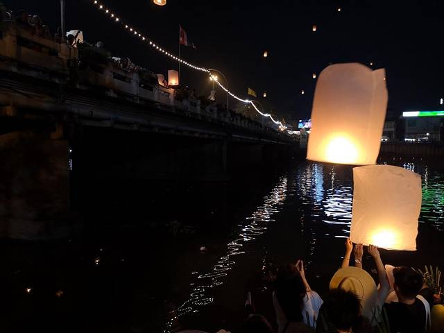 为了避免安全隐患古城内不许放天灯,塔佩门外的巷子里有陆陆续续的几盏可以忽略不计。免费场主要集中在纳瓦拉桥湄平河边。这是名副其实的万人场。即可以放天灯也可以放水灯。一定要去感受下人声鼎沸的场面!