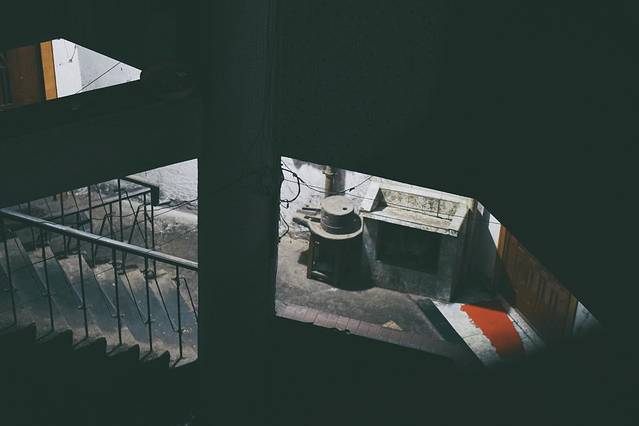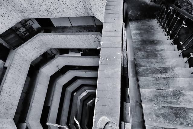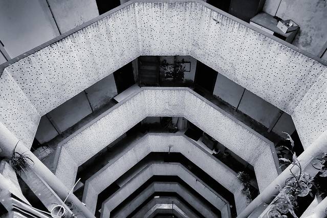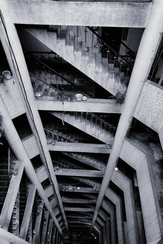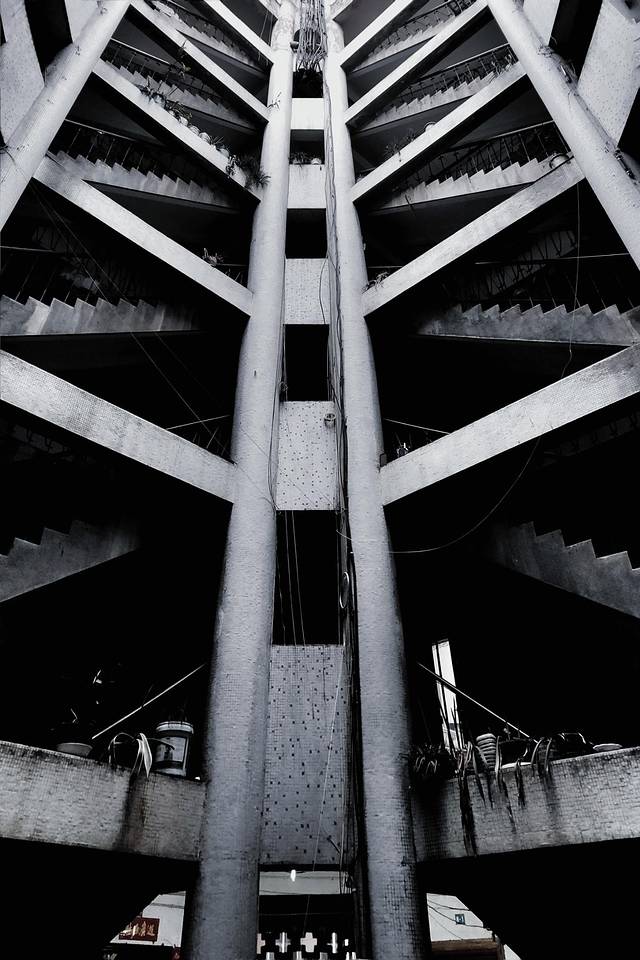 进入楼里会比较压抑,只有最顶上的几层采光还行,其他地方都很昏暗,整栋楼从外观上看没有什么特色,进入到内部才能感受到玄妙,晚上个别楼层会有暖黄色的光,可以用大光圈拍摄局部。