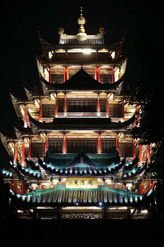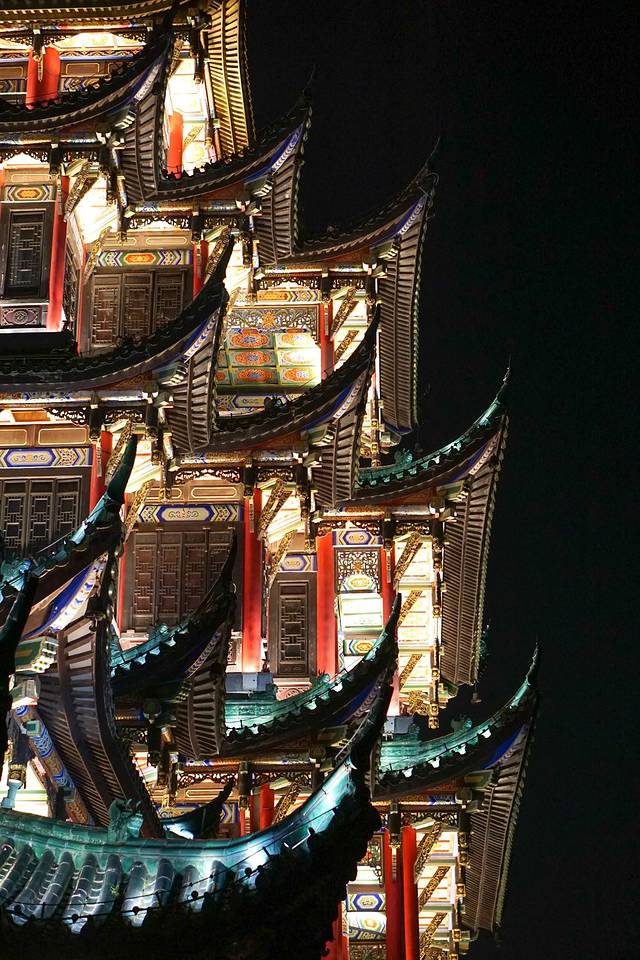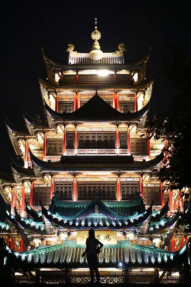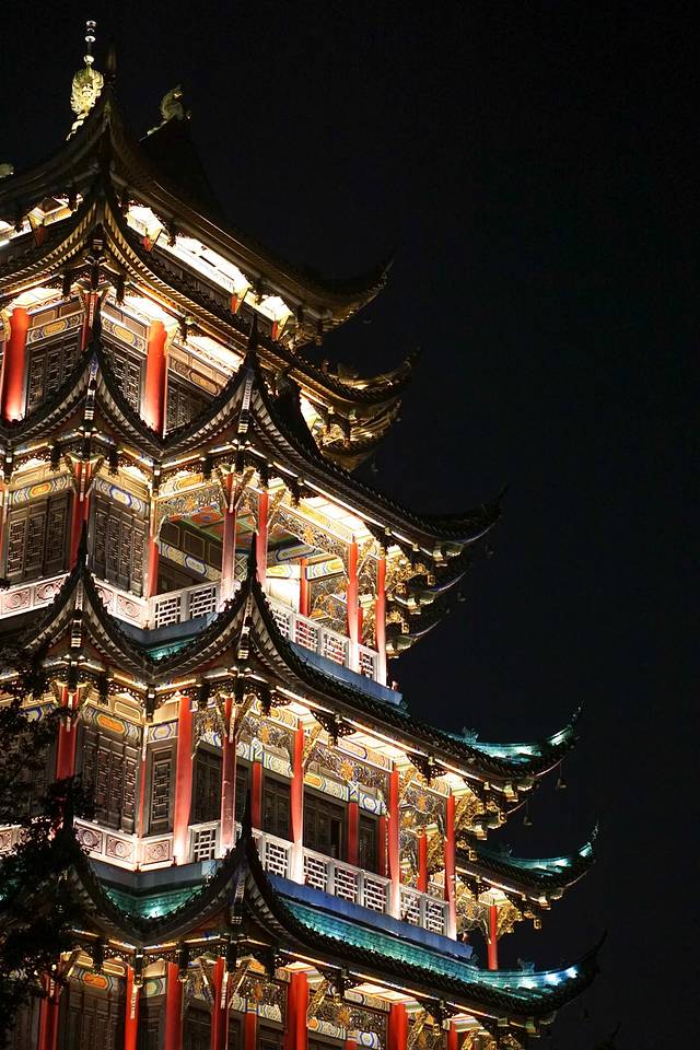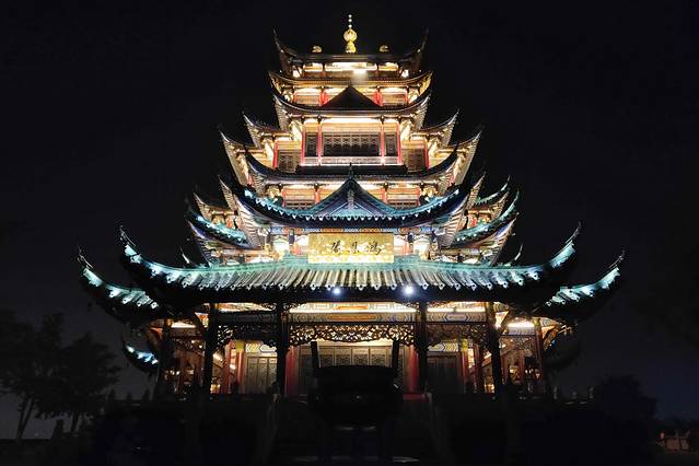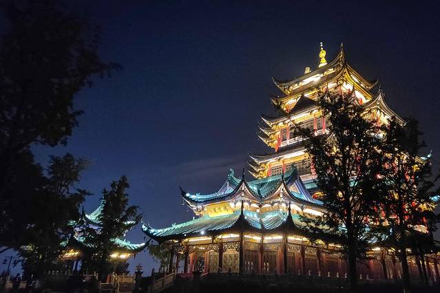 这个楼阁因为国外那对签收走世界的夫妇拍的照片火了,鸿恩寺森林公园山顶的这座鸿恩阁夜景灯光真的太美了,从远处就肉眼可见的震撼。