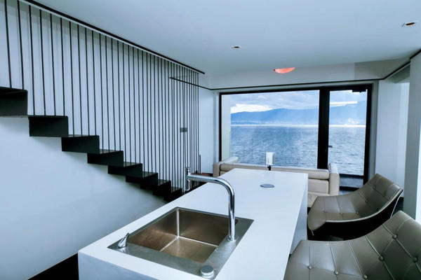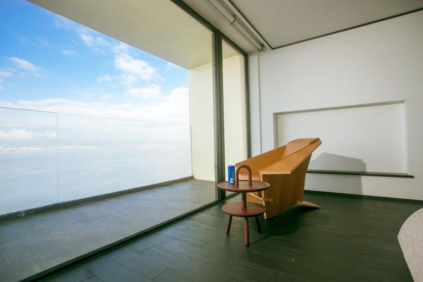 老板说房间内每个家具都是设计师品牌,希望十九山让客人感受到舒适和美感兼顾。话音未落,美妙的音乐声响起,是来自Naim的音响;原木的餐桌,是来自意大利的Cassina品牌,小到连吹风机都是戴森的...看得出老板是非常注重生活品质。室内空间开阔大气,功能完备。全景落地窗采用全自动安全窗,采光也十分注重光影氛围。