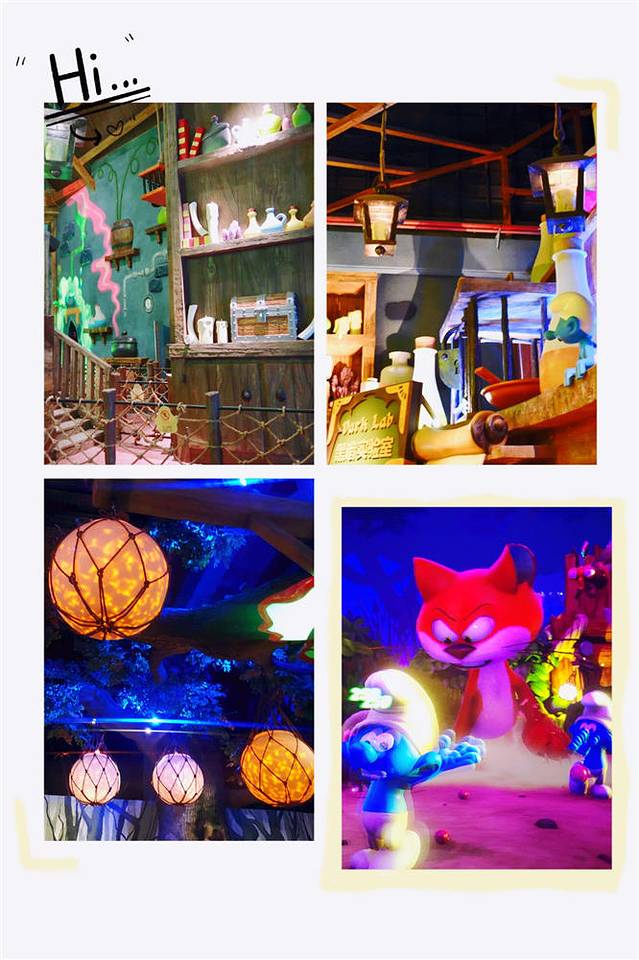 穿过蘑菇村庄便来到了格格巫的家,灯光明显变暗了许多,斑斑点点地照在地上。原来我一直觉得格格巫和阿兹猫特别蠢萌,经常因为抓不到蓝精灵而吵闹。在这里阿兹猫会突然从某个角落冒出来。这里先给你们推荐几个必打卡项目,我认为还比较适合大朋友们的