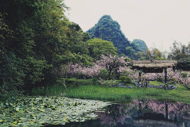 进入的方式很特别,需要先乘坐轻舟,游览湖光山色,再穿过一个低矮山洞才能到达。驶入山洞后一片漆黑,只能看到前方有一束光,随着船慢慢往前移动,仙境般的桃源豁然开朗。