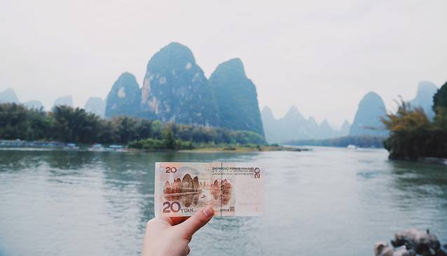 在码头等船的间隙,Pom Pom把手伸进口袋,随手掏出一张20元人民币,发现背面的图案跟远处的山景、水景如出一辙。