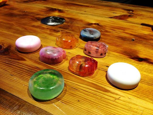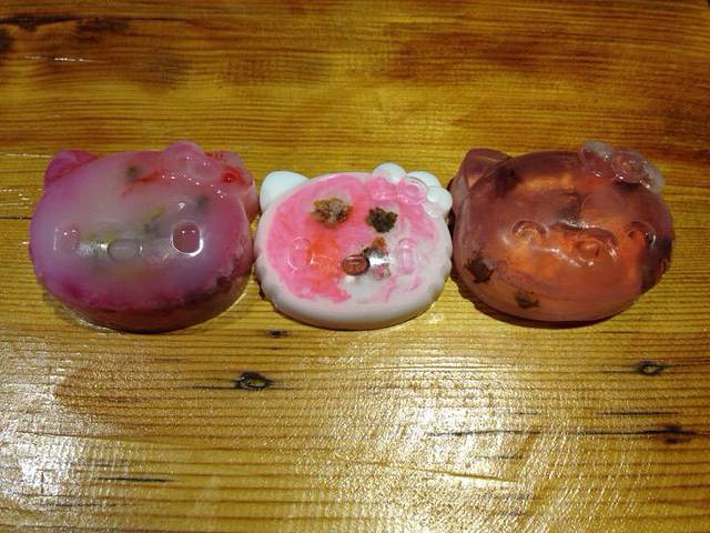 我们刚来的时候,就发现展柜里放着有桃花皂,凯凯说这是之前的客人做的,有的也是他们自己做的。