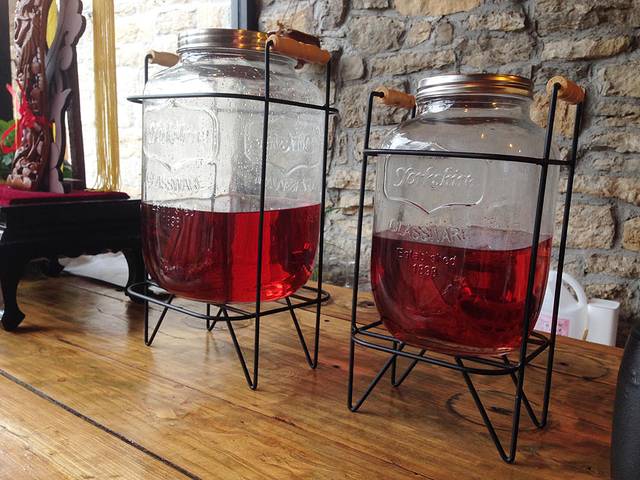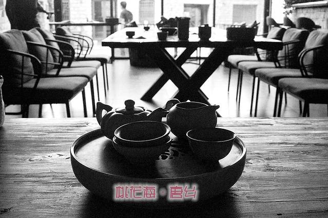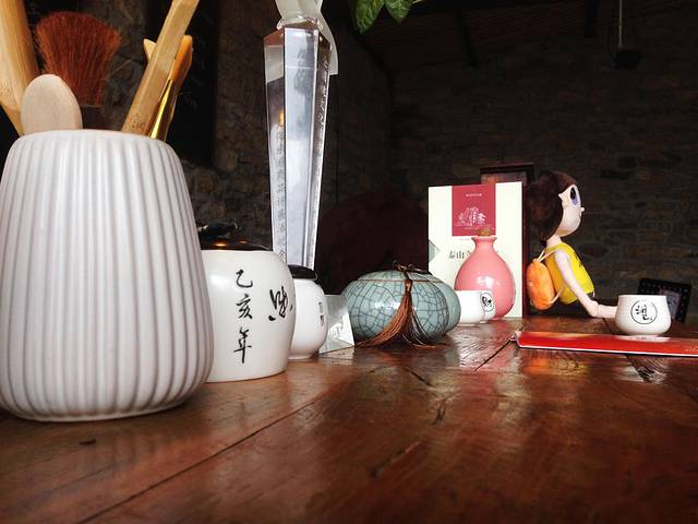吧台上摆着一排陶瓷的瓶瓶罐罐,里面放着各种茶叶和桃花酿。鱼山古村和周围的村子有万亩桃林,所以桃子是当地的特产,味道确实比较甜,桃花酿自然也比较香甜。
