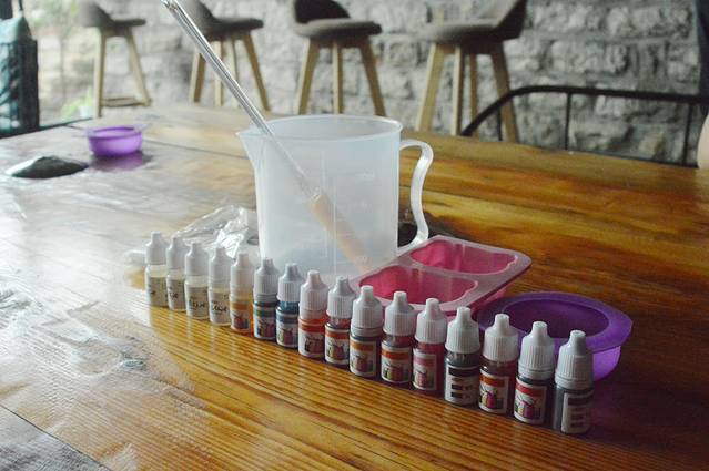 倒入模具,倒入一半,然后加入桃花、颜料、精油,还有香料等,根据自己的喜欢来加入,享受DIY的过程。