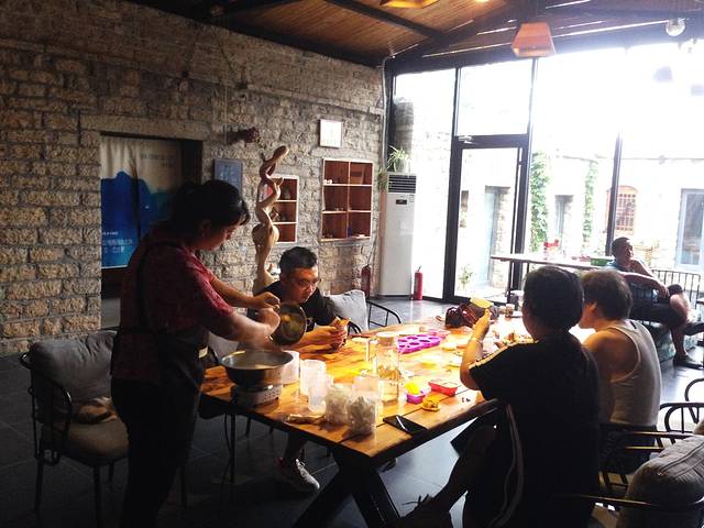 店长凯凯在忙碌着,为大家准备着当地的美食。店里有桃花酿和咖啡、茶水等饮料哦!