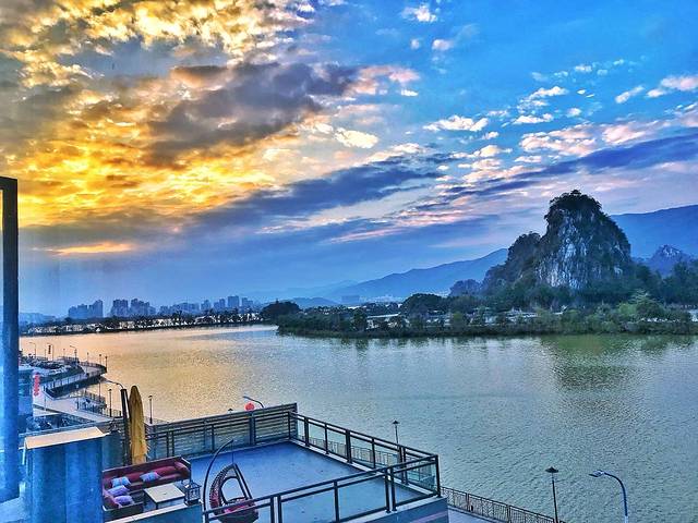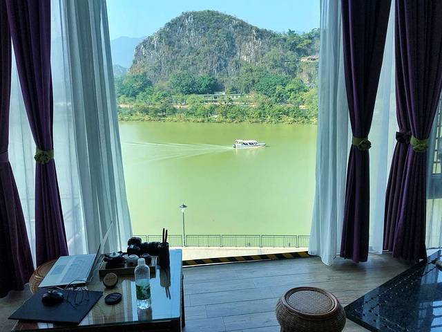 涟岸的客栈一共有14间。每个房间的幔纱自然下垂,透过朦胧的玻璃拉开,湖面波光就引入眼帘,七星岩倒映在湖面上对称开来。好一派美景鸿城……