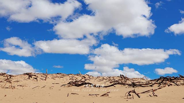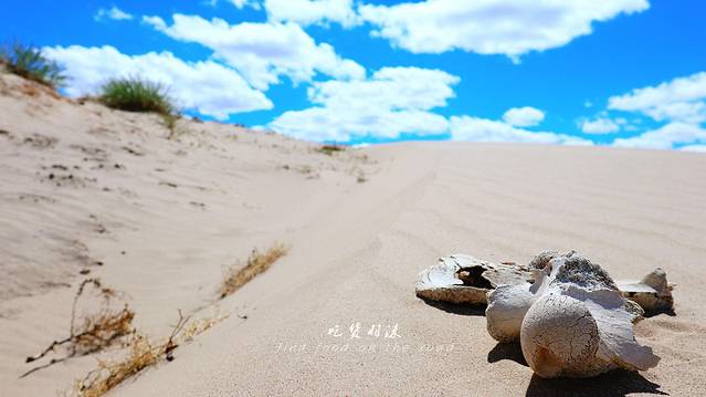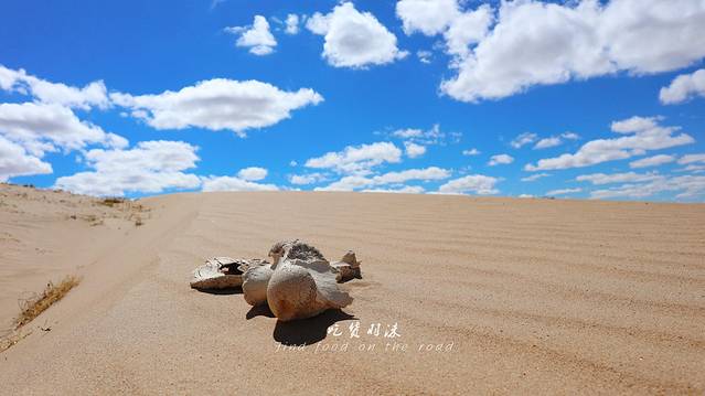 黄白的沙子吹成了一条长长棱线的小沙丘,最有意思的是我在黄沙里看到一个大骨头,风突然吹过,后背一阵发凉,让我想起了纪录片魔鬼城的片段,说来真实惭愧,居然有些小害怕呢。