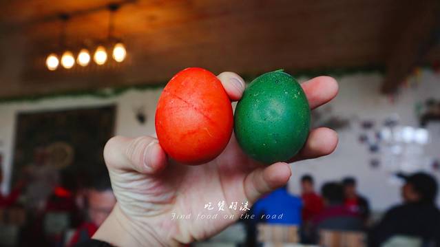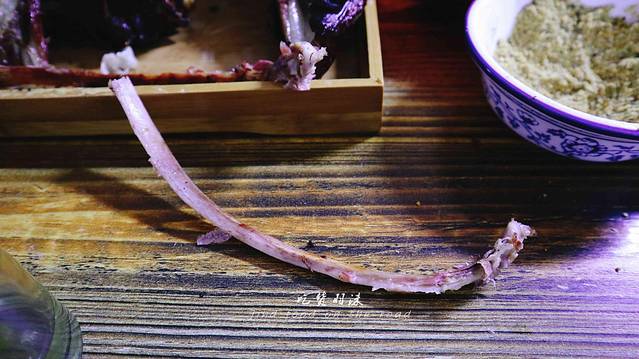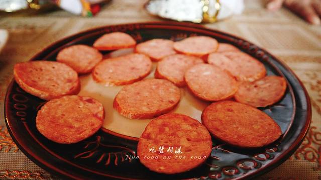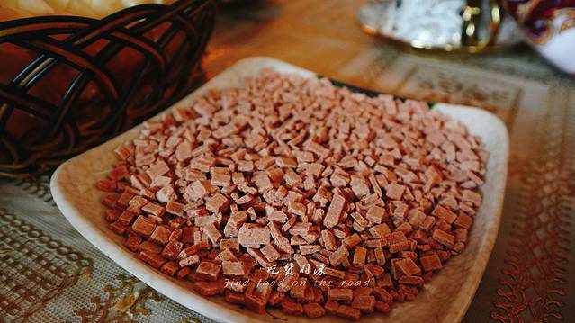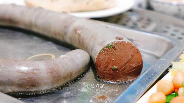 血肠看起来是不是难以下肚,吃的时候一定要用小刀扎几个小孔,当油脂流出,这时就可以吃了,用小刀割一块下来,蘸着蘸料,入口竟是如此软绵,嗯?不对,中间有一些小颗粒,段哥说:这是姜和香菜,专门用来去除羊血的膻味,口感很棒,软绵弹脆,令人难以忘怀,可惜吃多了还是有点腻的慌。