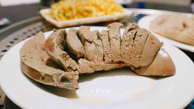 羊肝比较软弹,本身味道较重,蘸料吃还阔以