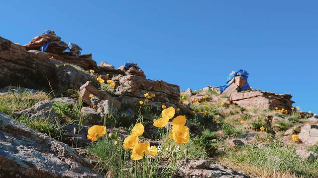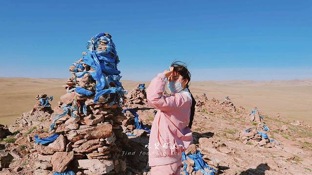 第三站:敖包山,一座堆满大大小小敖包的山丘,姐姐来到这边时,满脸掩不住的幸喜,彷佛能看到她眼中的好奇和喜悦,山丘之上生长着很多小黄花,非常好看。