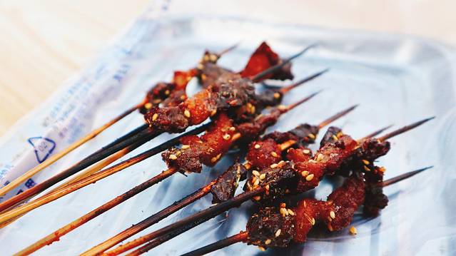 这条街上比较特色的是牛羊串,有2种方式,一种是炸的,一种是烤的