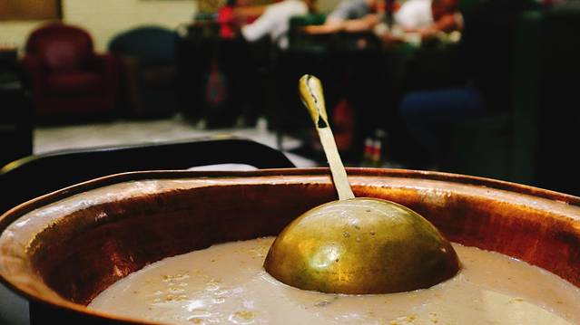 锅茶是用炒米、牛肉干、奶皮子、酥油等食材放入锅中,用大勺子反复炒制,然后把煮好的奶茶倒进铜锅里,等待片烧开之后即可饮用。