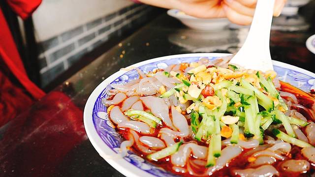 【评价】汾阳当地的特色美食,用绿豆淀粉做成的,把粉卷成长长的圆柱体,然后切成小段,上面撒上花生碎和黄瓜,佐以本地秘制酸辣口的酱汁,山西本土的酸,不辣嘴,夏天吃这么一碗超级爽滑。