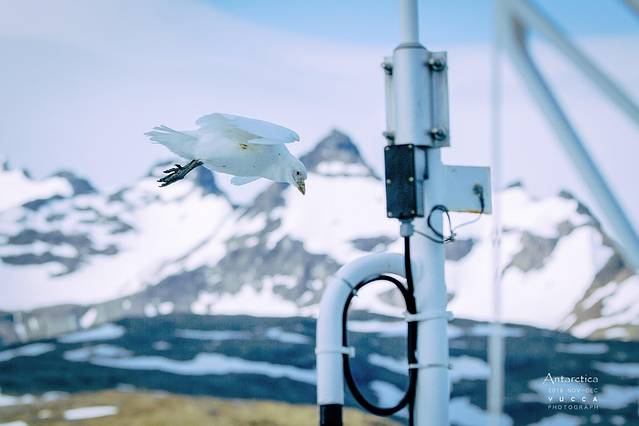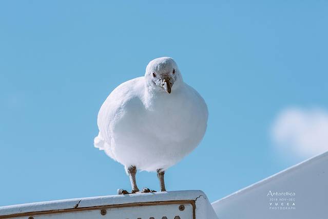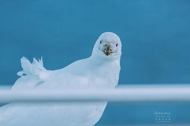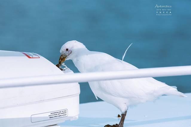 不过会在船上逗留,大大咧咧不把自己当外鸟的,基本上只有白鞘嘴鸥Snowy sheathbill,这种海鸟虽然主要靠鱼虾为食,但脚上没有蹼,不能在海上捕食,飞行能力也一般,所以经常会投机取巧,干点偷盗的勾当。