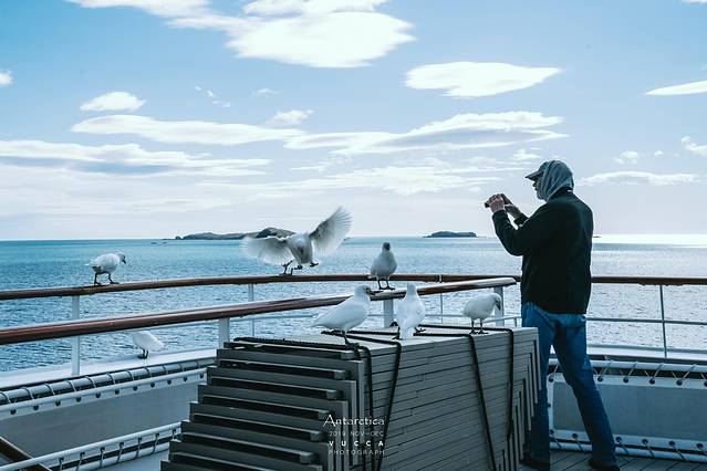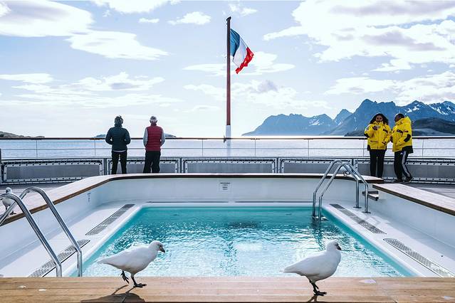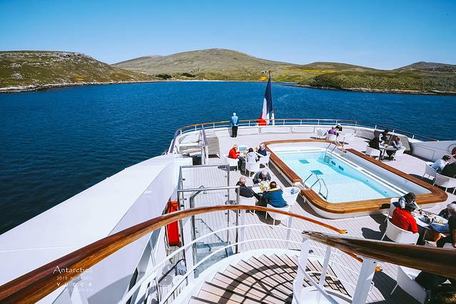 天气没有想像中寒冷,到南乔治亚之前几乎不用加什么衣服就可以在船舱外逗留许久,露天泳池在气候温暖的时候乏人问津,进入零度圈反而迎来了几个勇士。这个游泳池在6层船尾餐厅外的甲板上,同样是甲板,船尾和船头的体感温差相当大,我有时为了取景在船头和船尾间穿梭,在船头要使出洪荒之力顶开舱门迎接狂风的洗礼,百米外的船尾此时可能还称得上风和日丽。