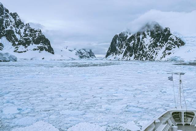 因此我大部分时间喜欢躲在船尾发呆、逗鸟。那里悬挂的法国大旗我也早已见惯,直到进入勒梅尔水道,乘客们涌向船头的甲板,注视着星辉号一点一点压过结冰的海面,以高难度动作穿过美到令人窒息的峡湾,我才突然发现那里还有一面图形很特别的旗子,黑白条纹背景的左上角排列了11个和雨伞形状类似的图案——如果不是有人告诉过我正确答案,我无论如何脑补不出来它表示一种动物,戴着围巾的白鼬。