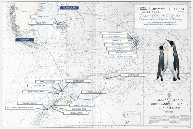 我一开始就决定了要选三岛线,走一个环形,除了南极半岛以外,还会去到福克兰和南乔治亚,我觉得南乔治亚很值得一去。一般这个行程在16、7天以上,多数从乌斯怀亚或者智利蓬塔阿雷纳斯出发,我们的船是个另类,从北边出发,路上要多走一天,但整个行程实际游玩时间10天,也还是可以的。