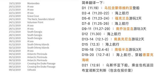 (这里需要特别关注一下实际游玩的时间,因为很多日程表水分很大,比如我们这个,整个行程跨度达到21天,但第1天下午才登船,第20天晚上已经到达港口,第21天一早离船,头尾都有水分。)