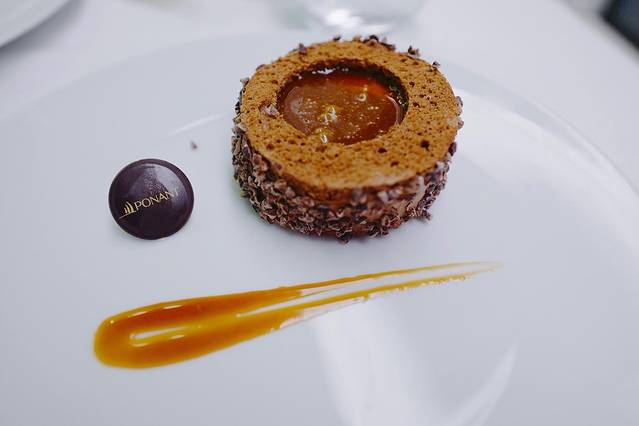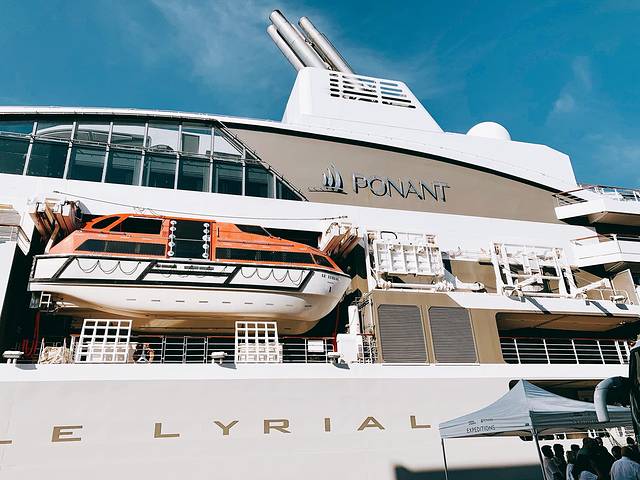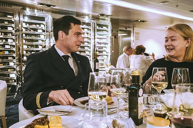 庞洛家有个叫White Party的传统,需要黑白正装出席,乘客根据语言(英文或者法文)选择餐桌报名,每桌5名乘客与一位船方工作人员共进晚餐,气氛约等于堂前会审。我们“提审”的法国小伙叫Xavier,在船上是仅次于船长的大官—Staff captain。一顿饭功夫他就被吃瓜群众问得差不多把这辈子都交待了。