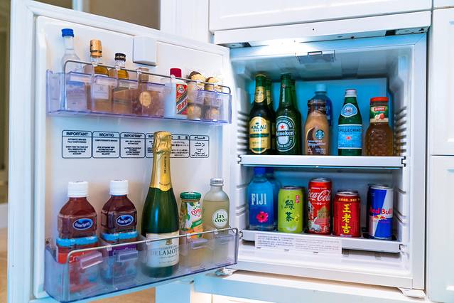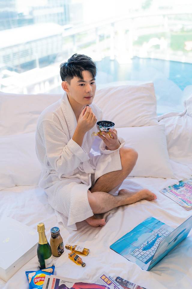 酒店的房间里提供许多酒水饮料,相信澳门其他的豪华酒店也是提供的,基本的矿泉水、速溶咖啡、茶包等等是免费的,冰箱里的红酒白酒零食是需要付费的,我把被单和枕头拿到窗户边,假装成一个靠窗的样子,现在网红都是这样拍照的,我也跟着学习一下角度。