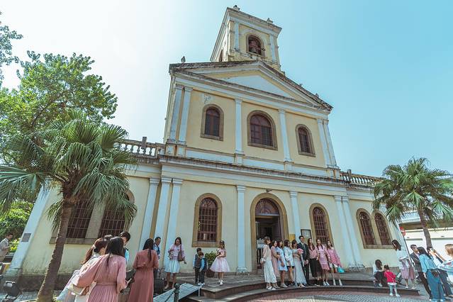 位于凼仔岛的龙环葡韵住宅式博物馆,便是典型的葡萄牙风格建筑,这里有五幢葡萄牙式住宅的博物馆和圣母嘉模教堂。龙环葡韵景区和大三巴牌坊一样,被评定为澳门八景之一。圣母嘉模教堂平时也很热闹,对面就是民政局,许多结婚领证的人在这里将爱情抒写在证书上,然后在教堂前面拍照留念。