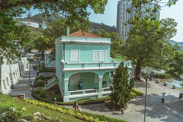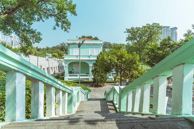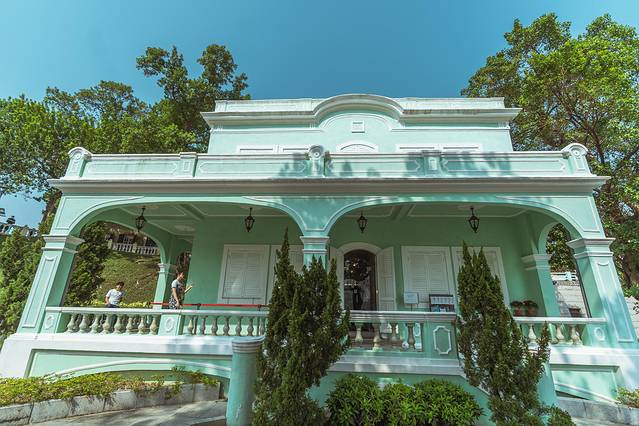 因为“龙环”是澳门氹仔岛的旧称,而“葡韵”则是形容仔岛葡萄牙建筑的风格韵味,所以这就是龙环葡韵住宅式博物馆名字由来。房子都是粉绿色的,晴天的时候,蓝蓝的天空,翠绿色的树木和粉绿色的建筑,画面非常的文艺好看。