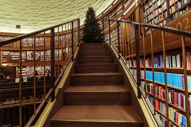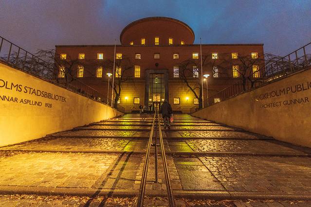 从名品街开车2公里,就来到了斯德哥尔摩图书馆。网上说这个图书馆外观非常普通,但我觉得还可以,这里的天3点就黑了,所以我在斯德哥尔摩许多地方都是黑夜里在逛,哪怕是下午三四点,我都有一种夜深人静的错觉。