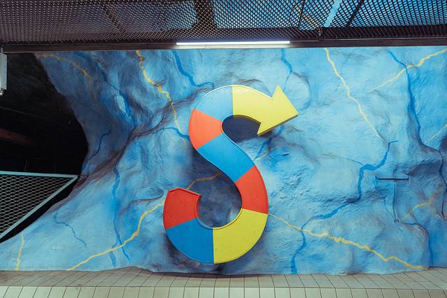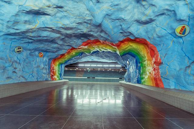 斯德哥尔摩有蓝线、绿线、红线,就像我们国内的1号线、2号线。我去的第一个站叫做Stadion,在红线上。这个站的特点就是蓝色背景,彩虹图案。
