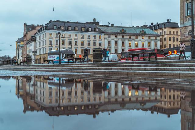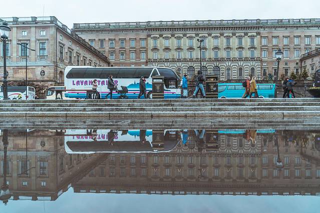 逛完老城,从斯德哥尔摩王宫下来,就是老城的湖边,沿湖一带也非常美丽。下过雨的湖边广场,水面倒影着斯德哥尔摩的王宫,也是不一样的角度。这个广场前面有雕塑,背后有教堂,都是拍照的好地方。我站在广场上,拍一组照片纪念一下。