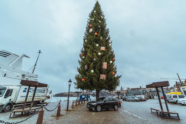 我在老城的时候,我把沃尔沃XC60 停在老城东面的停车场,停车场也在湖边,这里还有一棵很大的圣诞树。斯德哥尔摩停车很严格,白天晚上,周末或者工作日都有不同的规定,如果违停、不缴费的话,就是650元瑞典克朗的罚单。