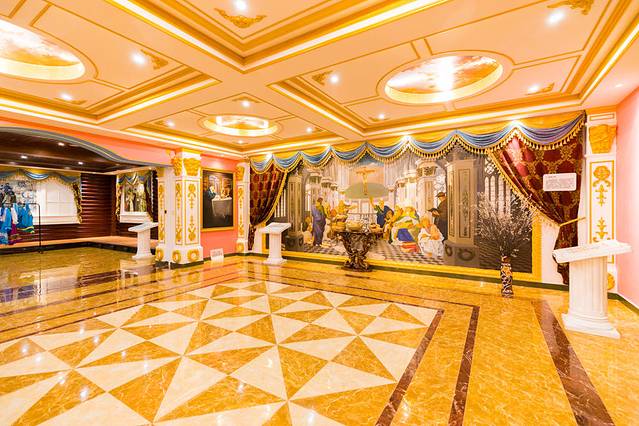 我们从展厅走过一段长路,这条路的地板非常名贵,一块地板就要几万块钱,一共几百块地板,所以很多人走在上面对地板都有磨损,也曾考虑过让游客穿着脚套走过,但是很麻烦,所以丽丽娅庄园的工作人员宁愿用刨光地板表层来保持地板的干净,然而越刨越薄,可见庄园对于游客的服务非常至上。