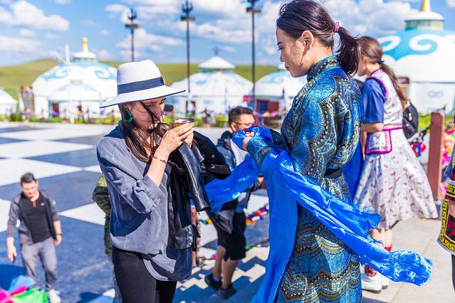 前面有说在内蒙主人欢迎客人总是会拿下马酒招待,给你多少喝多少。来到弘吉剌部后,这里的主人酒给我们准备了蓝色的哈达和下马酒,我也一饮而尽。