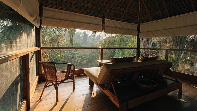 这样的野奢酒店竟然极其环保,不允许使用空调,夜晚的道路照明用的油灯而不是点灯,反倒徒增了几分浪漫。房间极其开阔,完全敞开,早晨光线从屋子的四面八方透进来洒在床上,被温暖的阳光叫醒。