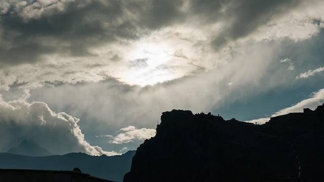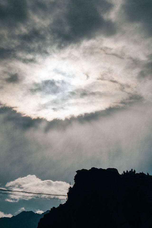 最美的风景不仅在目的地,更在沿途的风情。通透的蓝天白云,山峰高耸直插云霄,流动的云层逐渐散开,像开了一个天眼一样,光透过散开的云层洒落下来,给这陡峭的山脊镀上了一层银光。