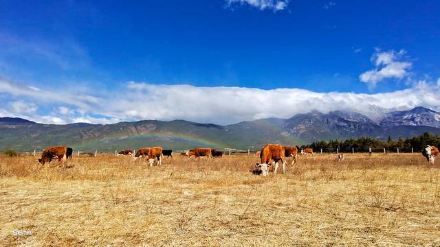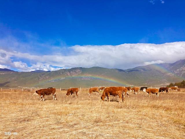 仔细看,我竟然用手机抓拍到了双彩虹,依附在草甸上的如云絮一般的羊群,高山背阴处线条柔和的积雪,蔚蓝的天低的与山相接,雨过天晴的双彩虹,真令人美到词穷。