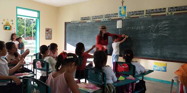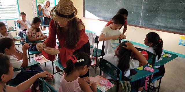 从酒店走到学校十分钟,到了学校刚好是自由活动时间,和老师沟通了表达了我们的想法后,老师表示欢迎,然后小宝哥做小老师,我做助教,教孩子们折孔雀。▼