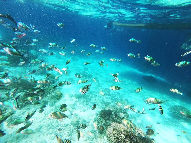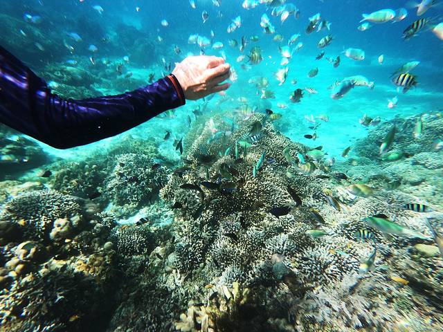 天气好,海水的能见度很高,阳光透过水面,照射到海底。闪闪发着光。在海里被鱼群包围,是什么感受。试试就知道了,给一点点碎面包屑。鱼儿马上成群的来。▼
