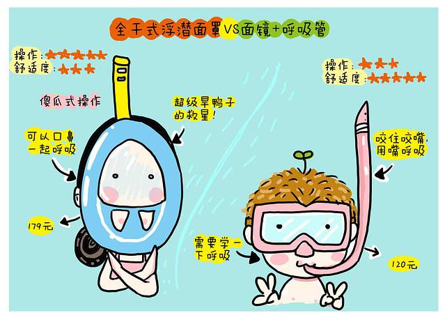 嗯哼,这里必须分析下这两种浮潜面罩。全干式面罩和普通的面镜加呼吸管,具体对比如图,本来全干式面罩我是给孩子买的。最后却给了我自己用,孩子会游泳,他觉得带全干式的不舒服,会进水(主要他脸小,吸不太住)。而我,是超级旱鸭子,这个全干式的面罩,拯救了我!所以,会游泳和不会游泳的。可以按需选择哦。
