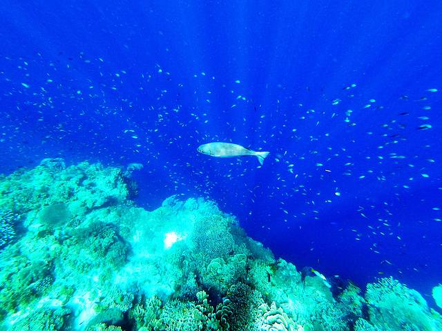 这就是大断崖边,望不到尽头的深。潜到大断崖边,脚底很空很美,看到海底发出来的光亮与成千上万的鱼群。断崖边是深潜点,深潜费用大概1800左右。▼