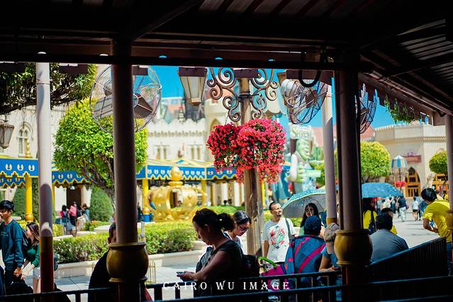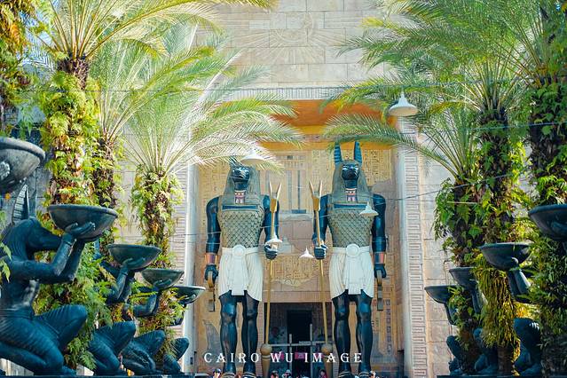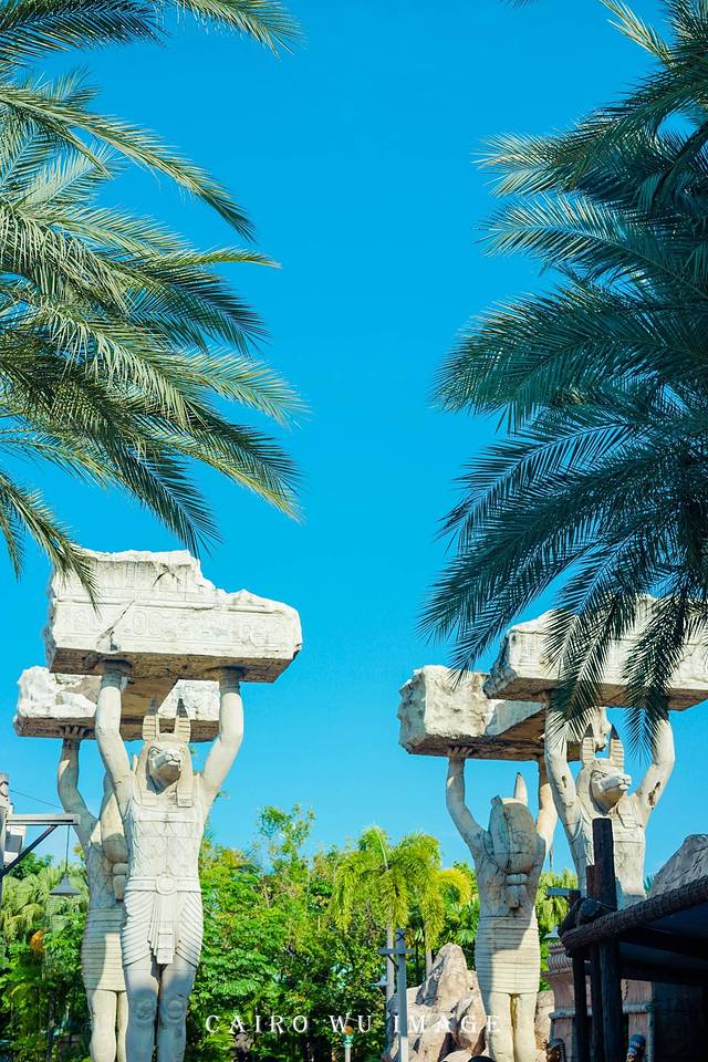 而且这个项目跟大阪不一样的是,他的船改成了圆形座位,这个设计真的有点尬,注定就不刺激。船在水里是自由转动的,运气好最后下去那一下没转到在那个落水位置即使不穿雨衣都不会湿,而我穿着雨衣,却成了全船湿透的那个人,头发湿完,刘海回形,后面就无限在质问自己为什么要先去玩这个,因为下午4、5点的时候园区人就变少了,项目最多最多也才排30分钟。所以,一定要先去拍照,后面慢慢玩儿,像热门的法老项目,后来根本不用排队上去就坐。