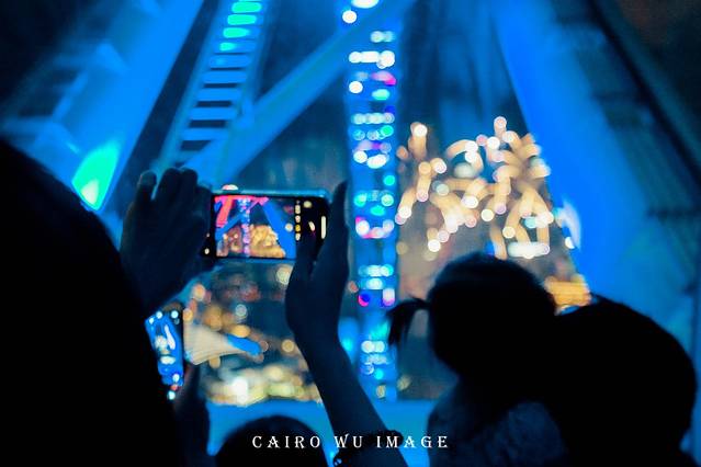 上升了一段高度,我发现有点恐高。不过看到开始放烟火了,就把这事忘了。我们当时位置不太好,但烟花还是很盛大相当的漂亮。整个座舱里面的人本来都在各拍各的,后来一致都在拍烟火。