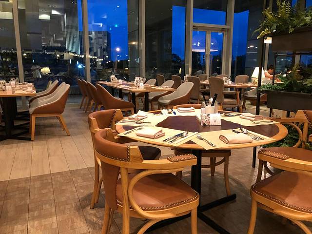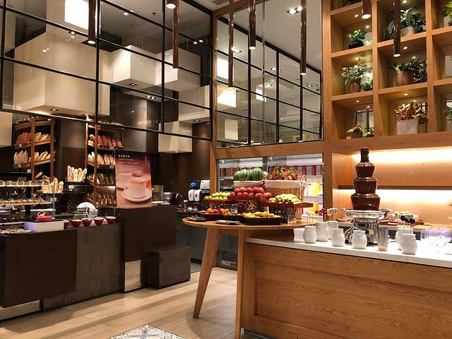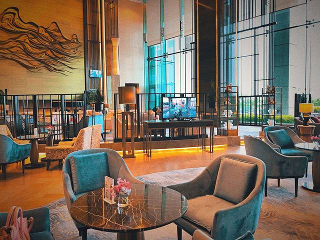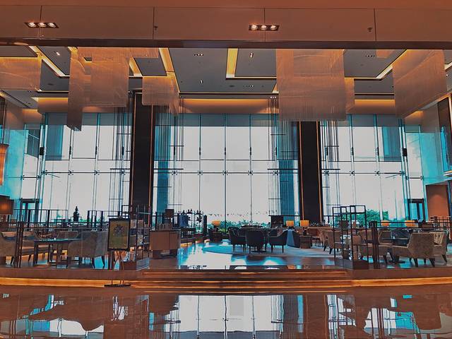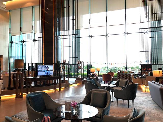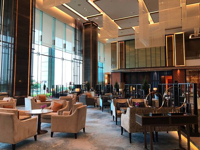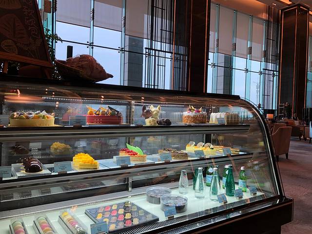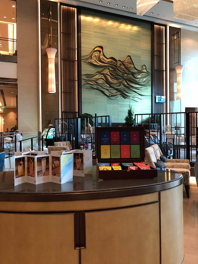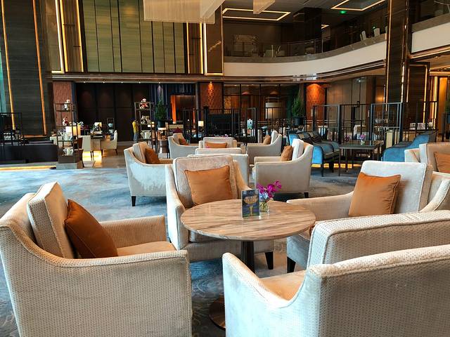 进了酒店的大旋转门便是酒店大堂,酒店的大堂吧可谓是宏伟华丽,可以看到窗外的海景。大堂吧给我的感觉很特别,橱柜里的甜品看起来也可口。不过你若是在大堂吧休息是要收费的。其实从大堂吧就可以看出一家酒店是否高级了。