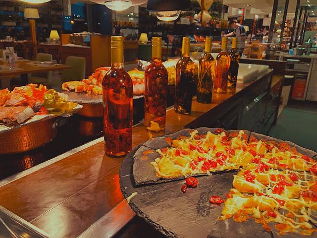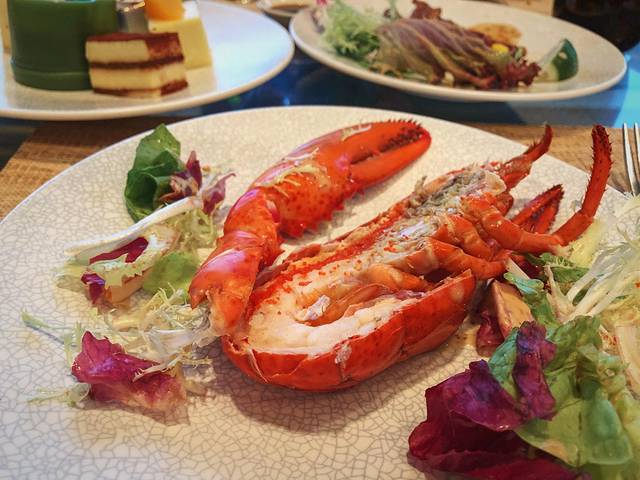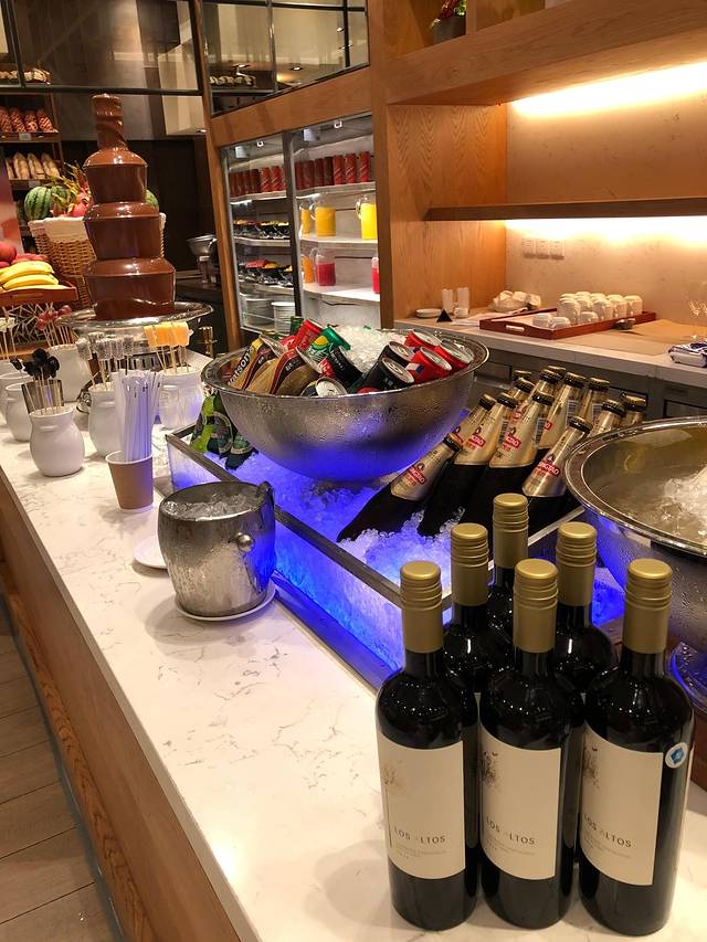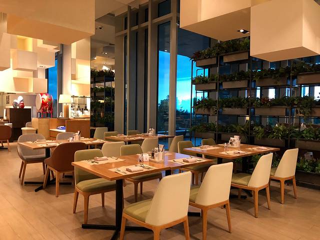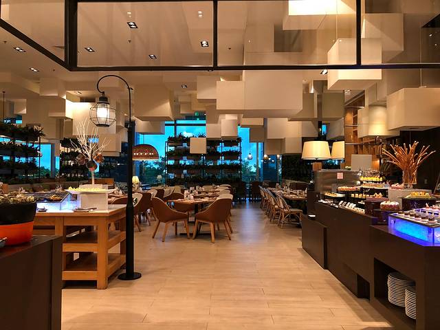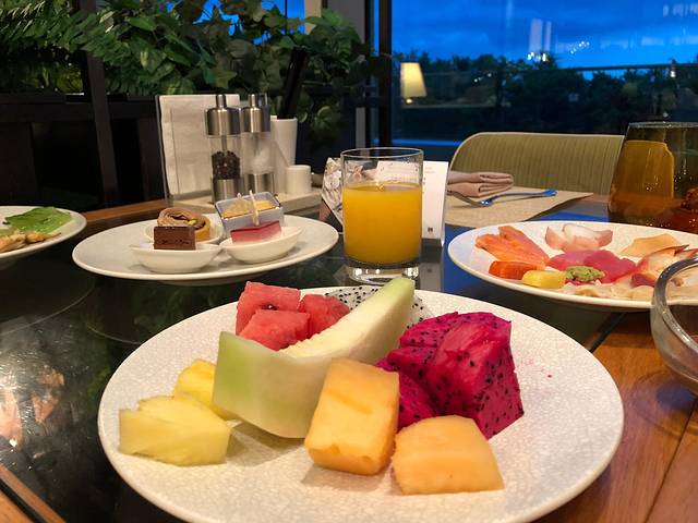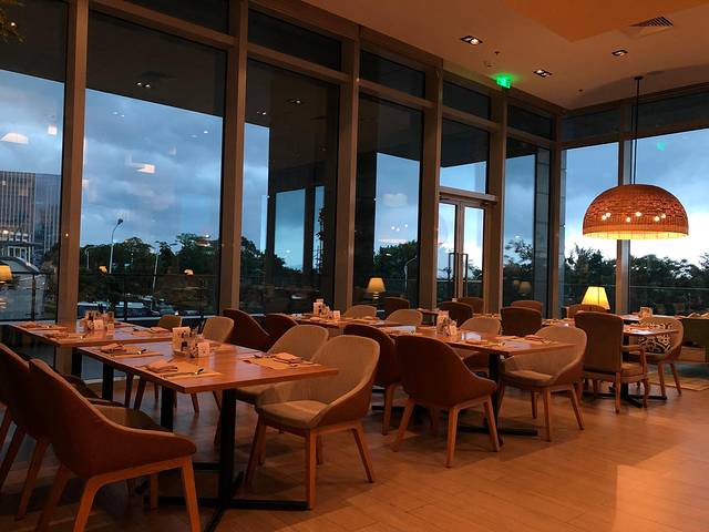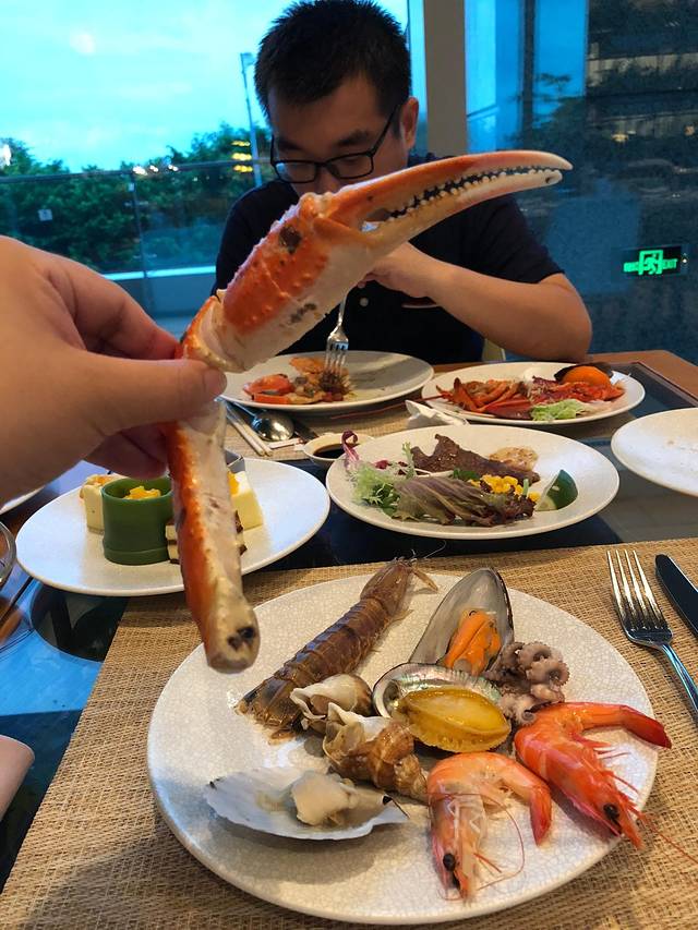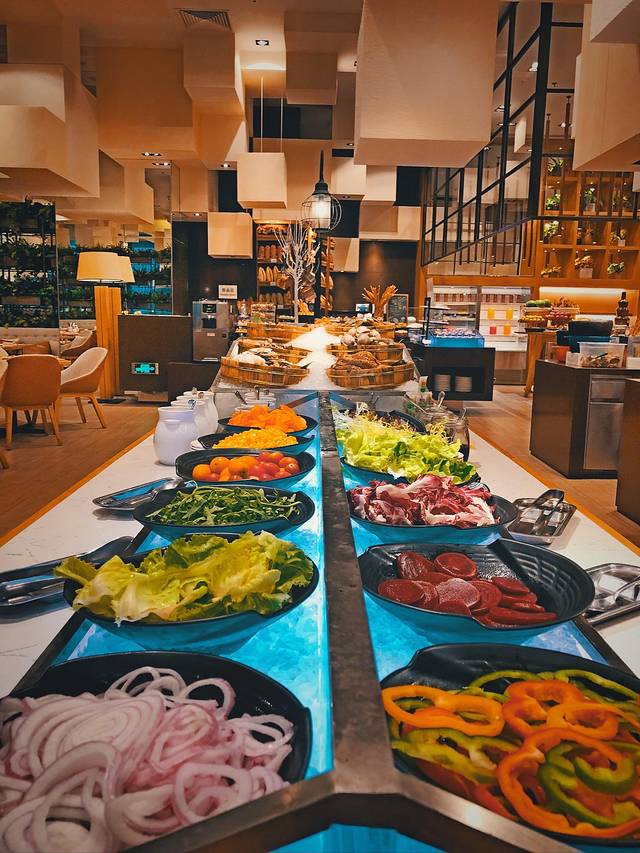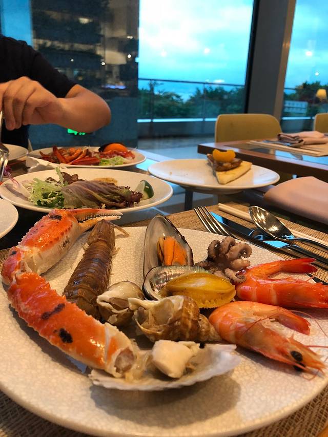 大堂吧的左边便是自助餐厅-馨石堂,餐厅呈长条状,面对琳琅满目的食物,我忍住了口水,选择了一个靠窗的位置,准备好好享受今晚的美食美景。