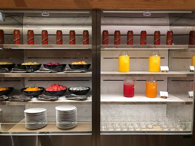 一进馨石堂自助餐厅便看到右边的水果区域,切好的水果整齐摆放在开放式冰柜里,其他未切的则和饮料啤酒放一起;