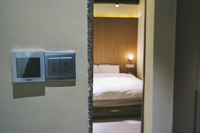 每座古厝一共有四间客房,越靠近里间,光线就越暗,然而现代化照明却能借机营造出不同的氛围。房间内部除了整体格局,其他都重新布置了。以住的客房为例,将原有的下房、榉头(即厢房)合为一个房间,巧妙地在狭长的空间里分隔出了卧室、客厅以及卫生间。原本偏门的通道成了分界线“”,一座大衣柜坐落在此。整个客房采用类似北欧风的简约格调,宽大的榻榻米床,一家三口也能轻松睡下,值得一提的是枕头竟然用的乳胶枕,可谓用心至极。大床两侧各有一座石窗,朝天井的一侧保留了“囍”字石头窗花,美观又透光。